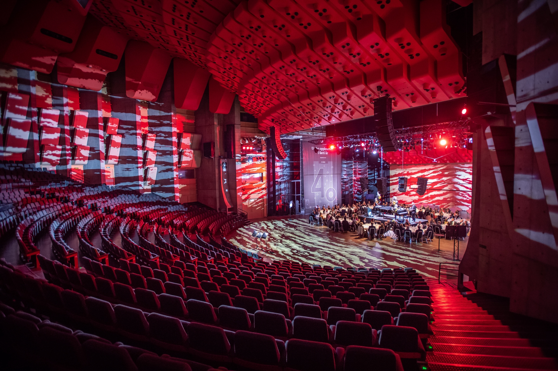 Scenen i Griegsalen kan benyttes til banketter og events. Scenen kan også skilles fra Griegsalen og fungerer da som et fullverdig møterom.
